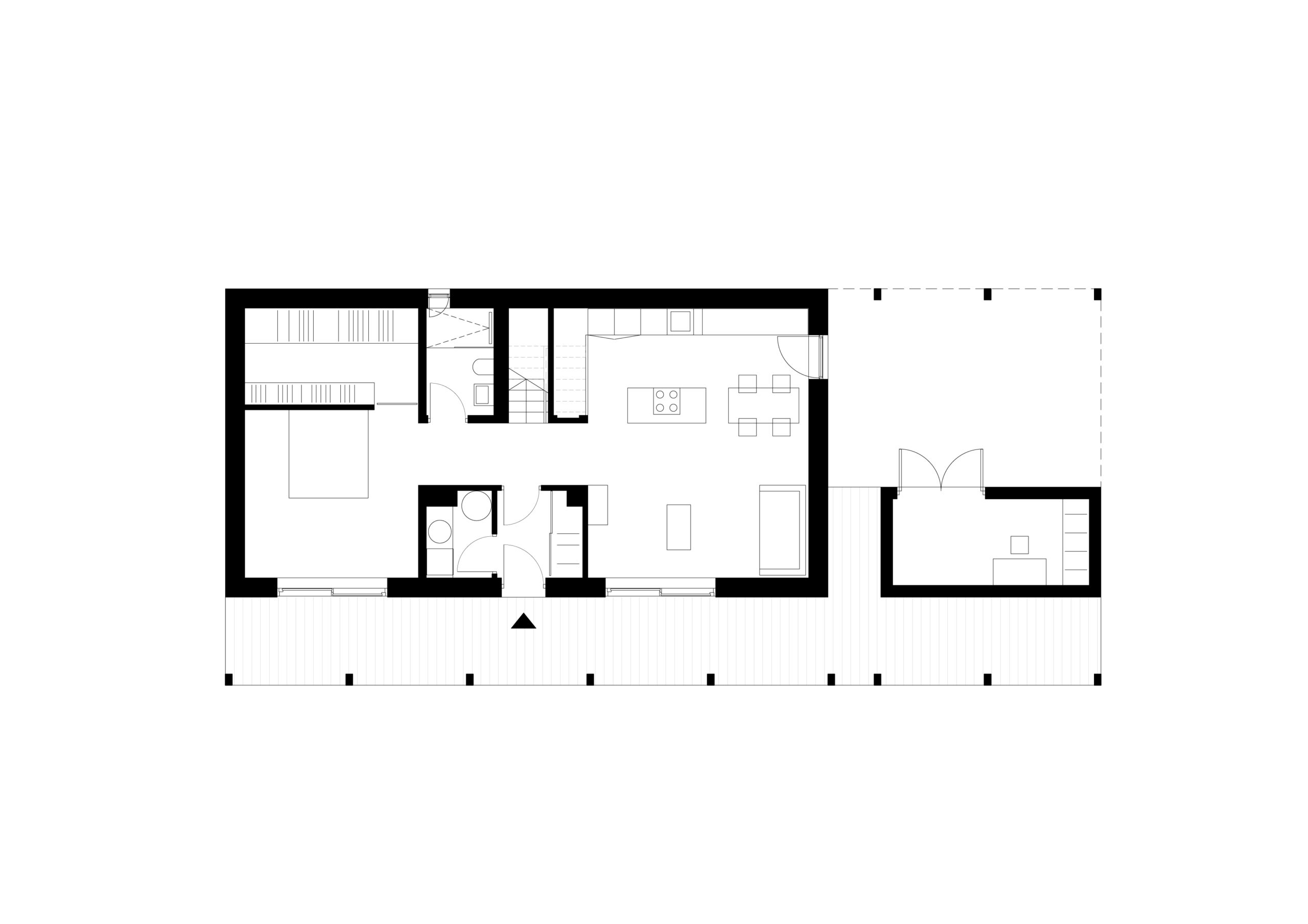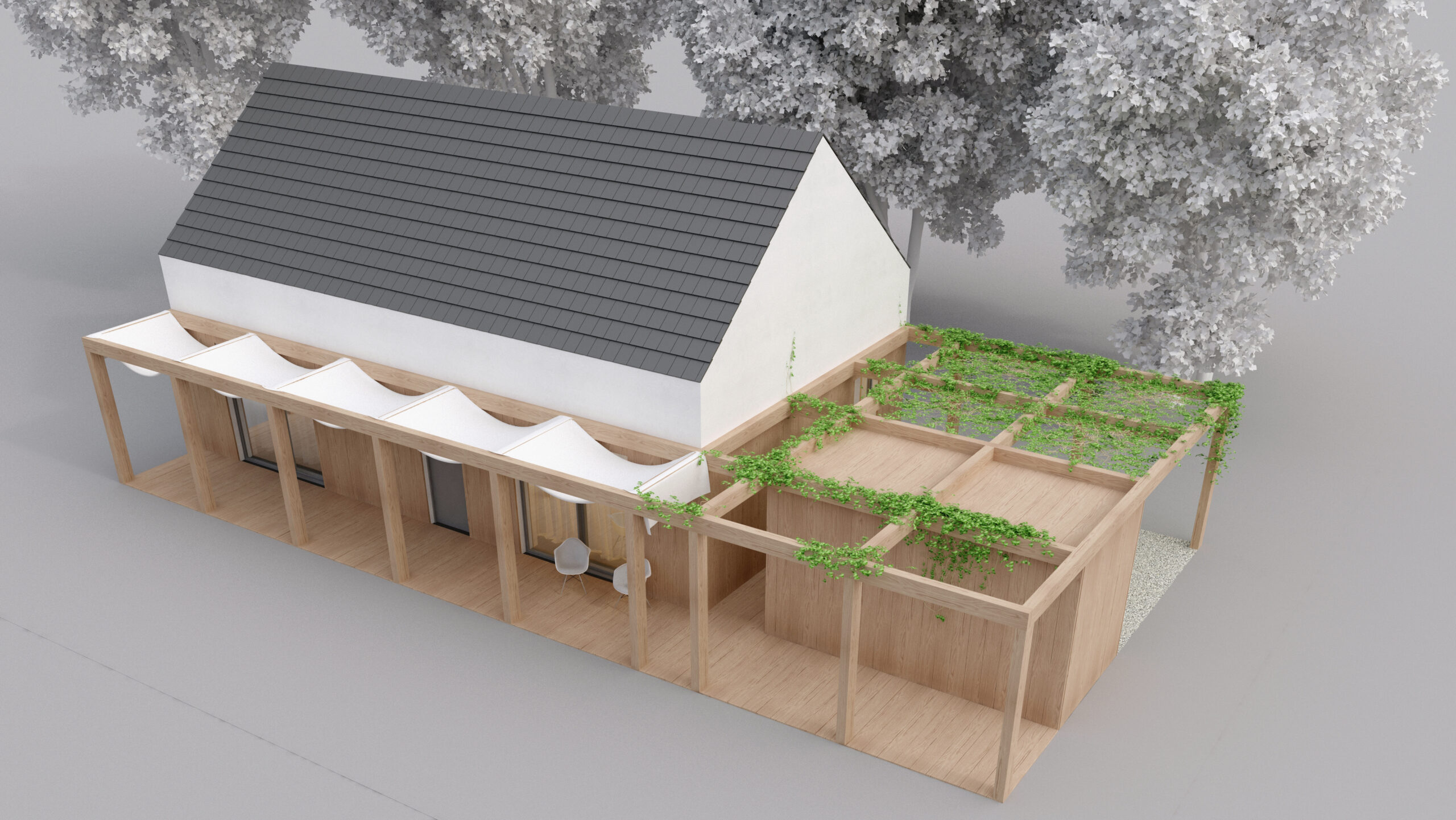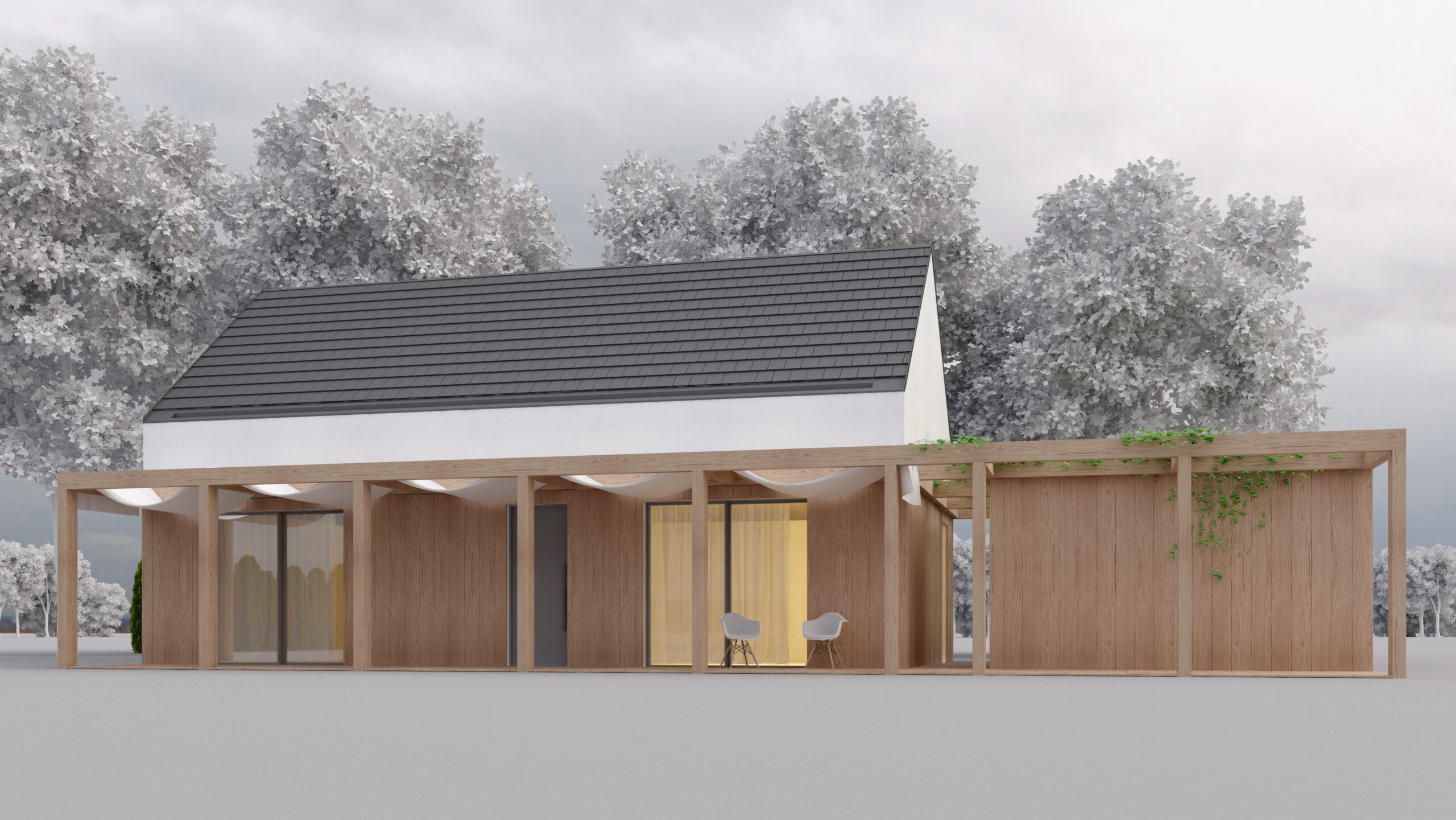 Niewielki dom z wielofunkcyjną, modularną pergolą. Wnętrze zaskakuje dwukondygnacyjnym salonem z kuchnią oraz otwartą na tą przestrzeń komunikacją poddasza. Inwestor - triatlonista potrzebował pomieszczenia na przechowywanie i serwisowanie sprzętu. Prostopadłościenna forma oddziela główną przestrzeń od miejsca postojowego dla auta.