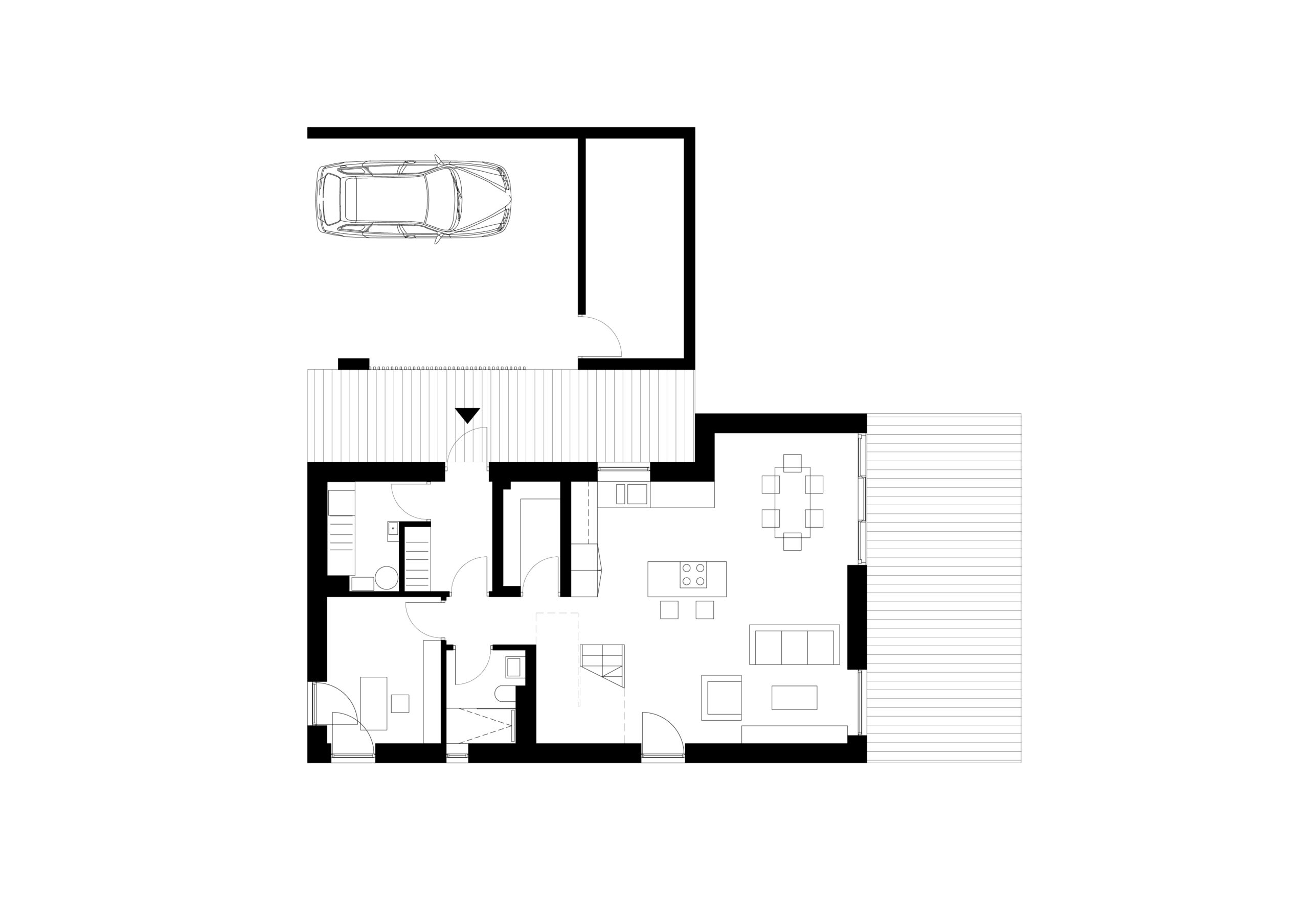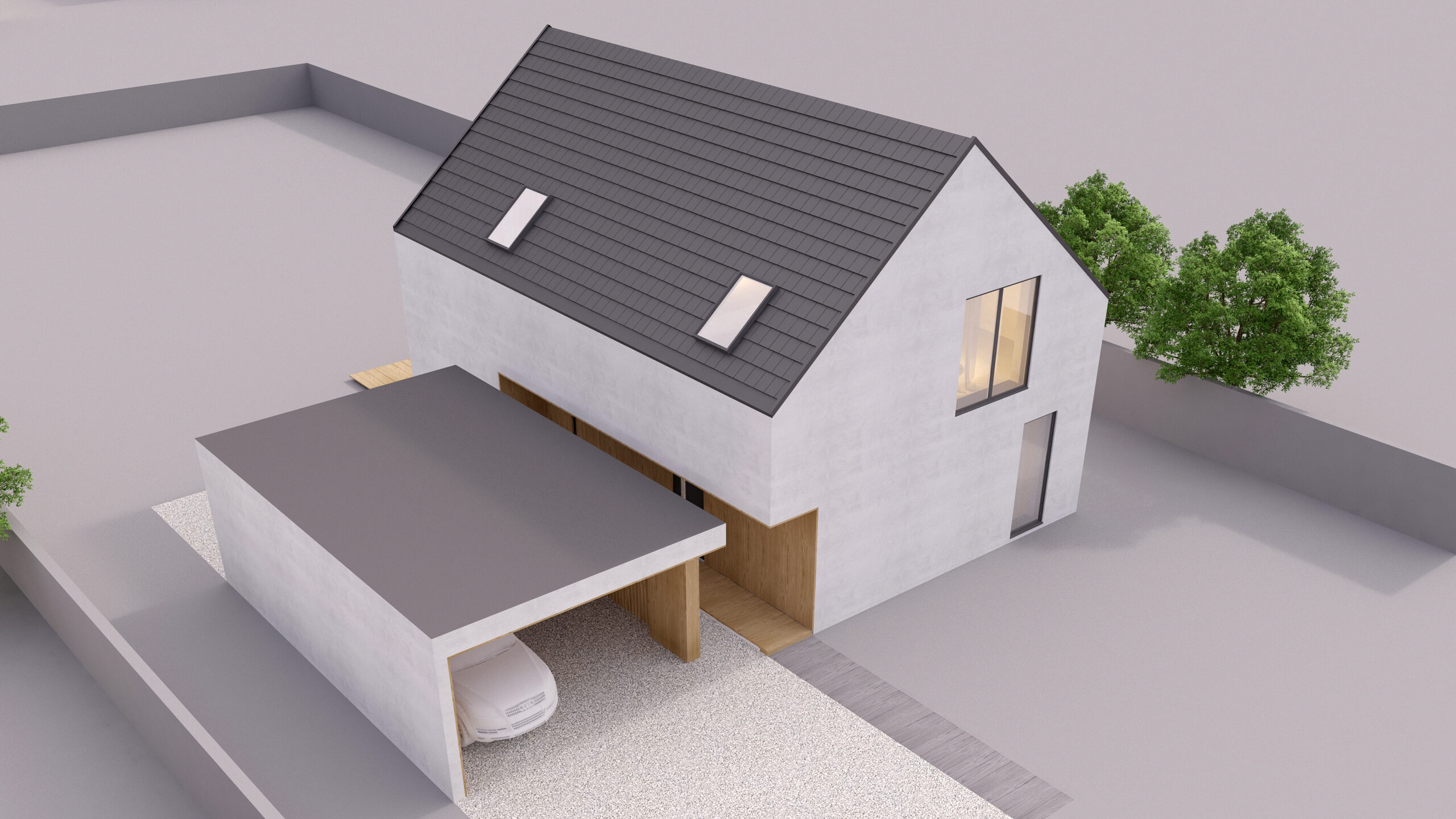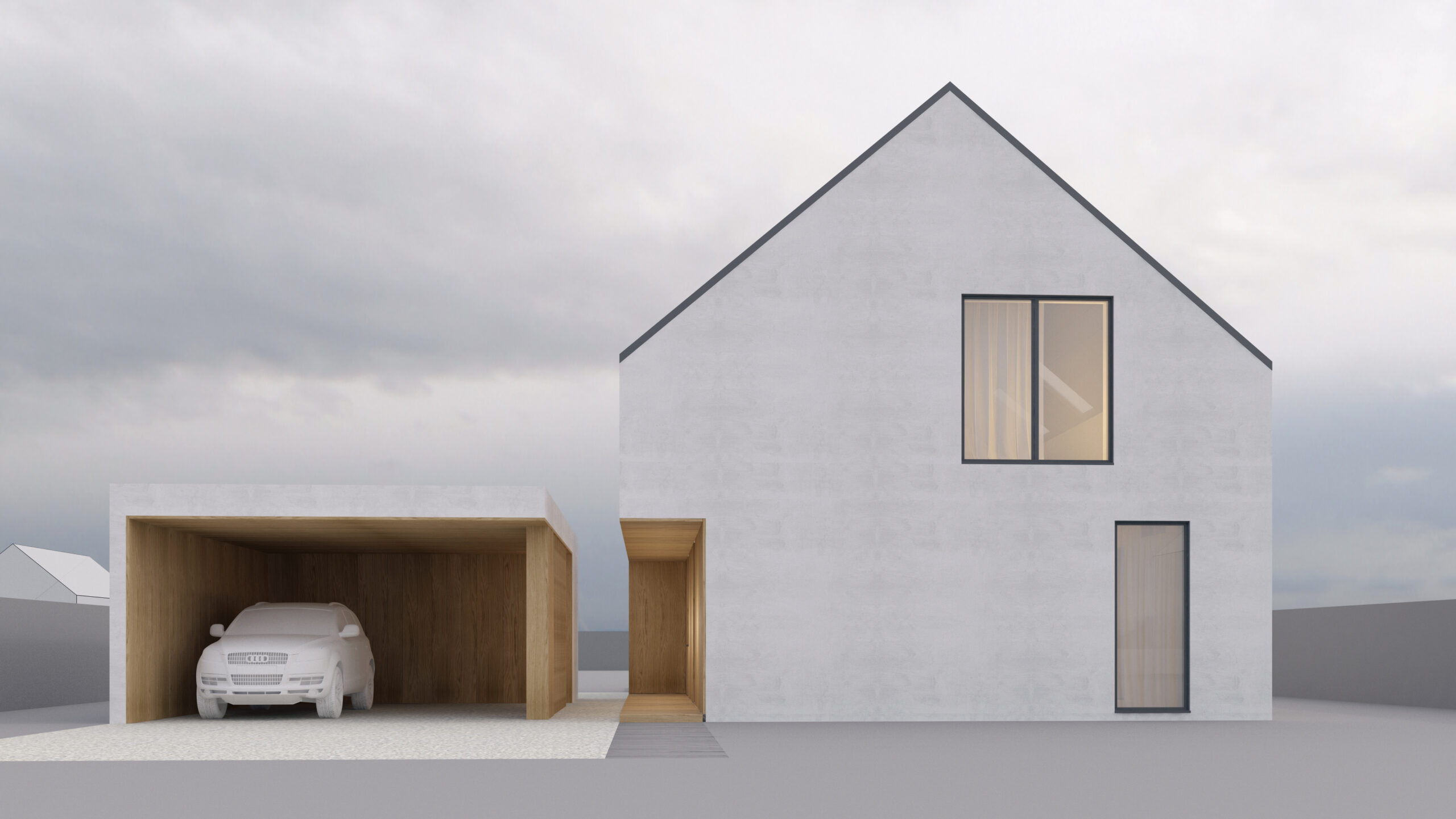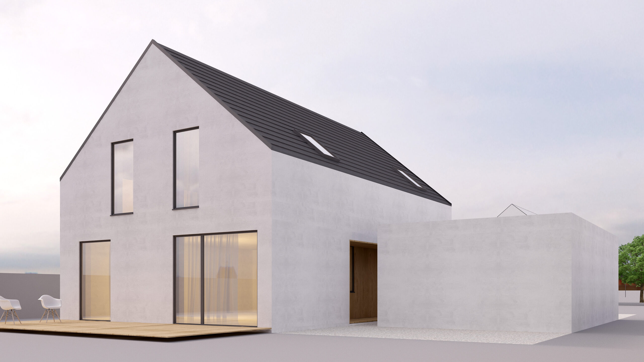 Uproszczona bryła budynku z podkreśloną strefą wejściową. Forma budynku wydziela prywatną strefę ogrodu.